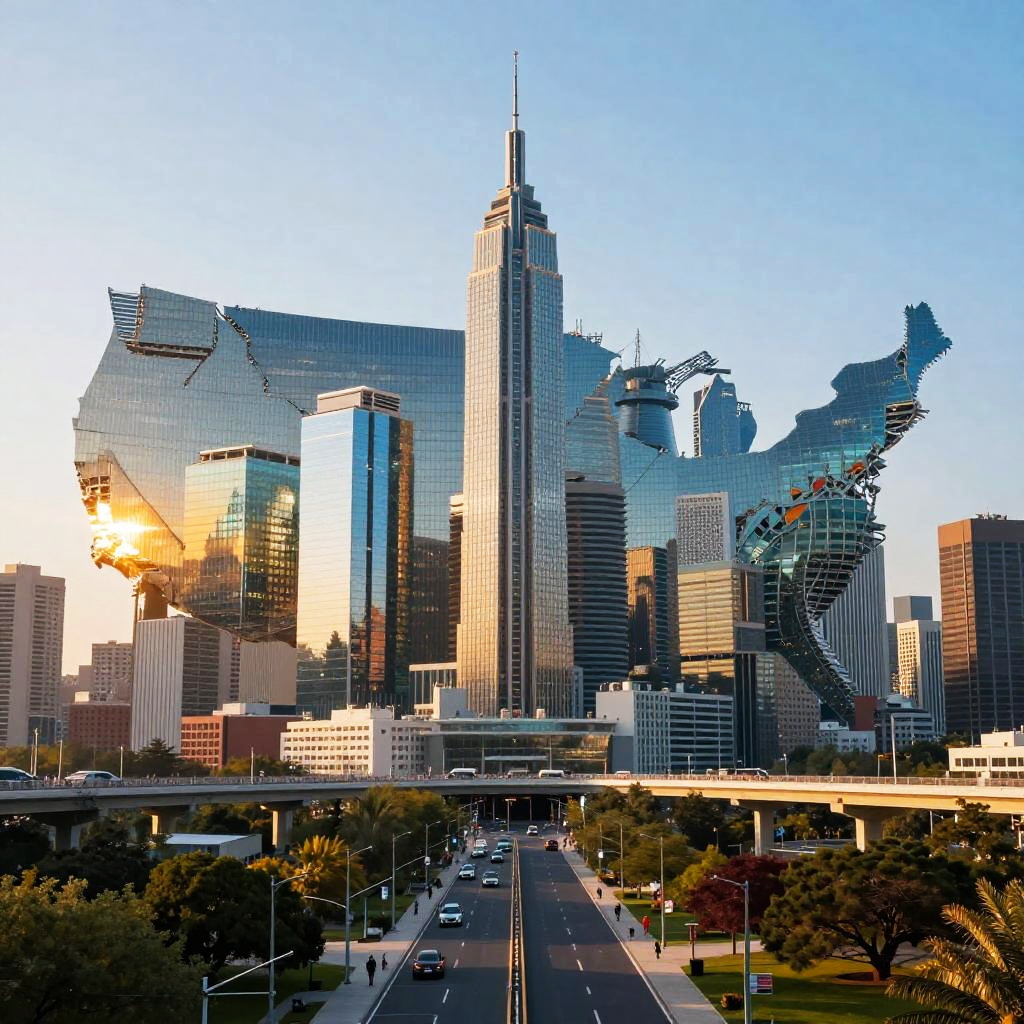 Comparison of US cities rendered in Stable Diffusion style, vibrant colors, hyper-realistic details, futuristic cityscapes blending urban and natural elements, cinematic lighting