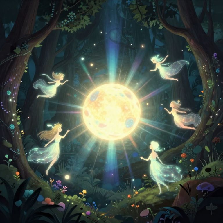 Digital artwork: Five ethereal, glowing fairy women with translucent wings dance around a radiant, sun-like orb in a dark, enchanted forest, surrounded by