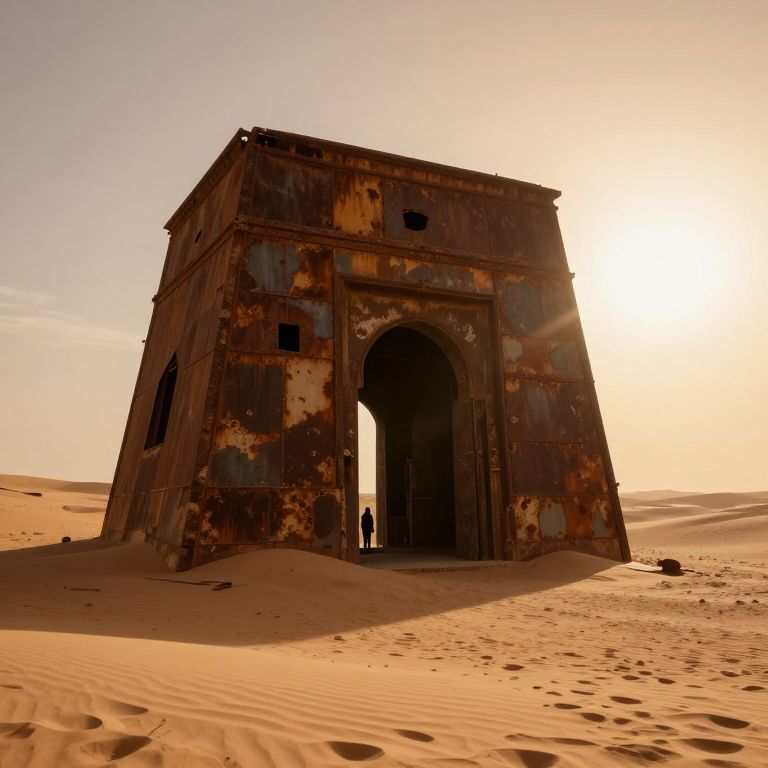 In the vast, sun-baked desert, an ancient, crumbling outpost stands as a testament to a forgotten civilization. The structure, a massive, rusted metal monolith, rises from the dusty sands, its weathered surface etched with the marks of time. The entrance, a dark, arched gateway, beckons from within, shrouded in mystery. The scene is bathed in dramatic lighting, with the desert sun casting long shadows and highlighting the textures of the sand and the outpost's corroded metal. The sky, a hazy expanse of orange and gold, adds to the otherworldly atmosphere. The lone figure, a silhouette against the bright backdrop, stands at the base of the structure, their form small in comparison to the grandeur of the ancient edifice. The overall composition is a harmonious blend of natural and man-made elements, creating a sense of awe and mystery.