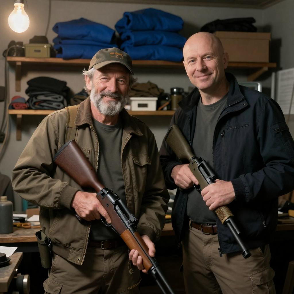 Photograph of two men in a dimly lit, cluttered workshop. Older man with beard, cap, holding rifle, smiling. Bald man, wearing dark jacket, holding tactical gear, smiling. Shelf with folded blue clothes in background, light bulb on left.