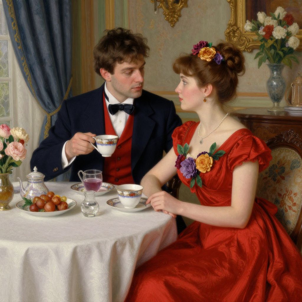 A romantic tea scene set in a vintage dining room, featuring a couple dressed in elegant formal attire, with the man in a navy suit and red vest and the woman in a red dress adorned with floral accents, captured in the rich, detailed style reminiscent of Russian Impressionism, evoking the timeless charm and warmth characteristic of Maya Kopitzeva's works.
