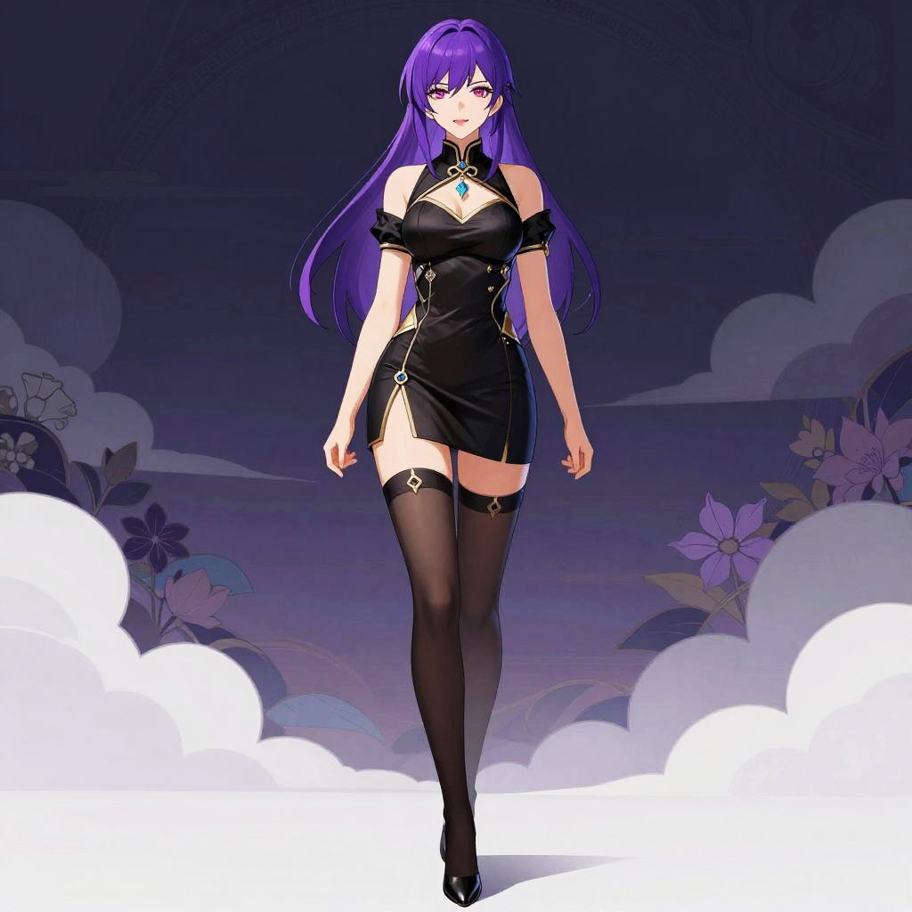 Digital illustration of a confident anime-style woman with long purple hair wearing a form-fitting black dress with gold accents, thigh-high stockings, and black high heels. She stands against a mystical background featuring stylized clouds and floral elements. The artwork combines dark fantasy and modern elegance with a detailed anime and comic book-inspired style.