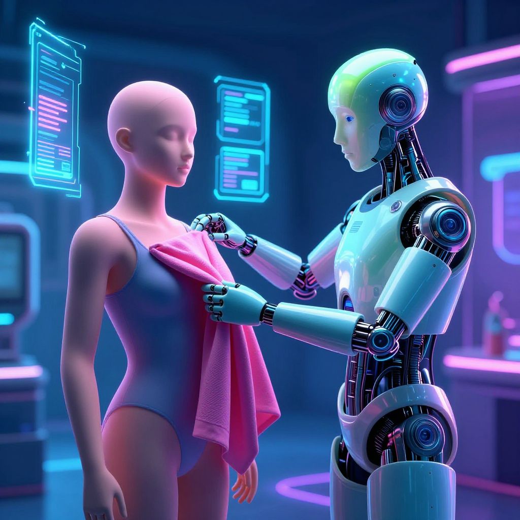 Ai cloths remover interaction scene, humanoid AI assistant carefully peeling clothes off a digital avatar, neon-lit virtual room, holographic interface panels floating around, seamless blend of organic and mechanical features, vibrant neon colors, ultra-detailed digital painting