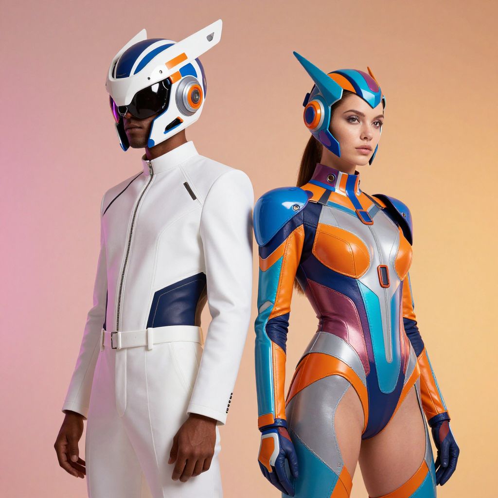 In this vibrant and futuristic advertisement photo, two individuals stand side by side against a warm, gradient background. The man on the left is adorned with a large, intricate headpiece that resembles a futuristic helmet, featuring a combination of metallic and colorful elements, including shades of blue, orange, and white. His attire is a sleek, white outfit that contrasts with the boldness of the headpiece. The woman on the right is dressed in a striking, form-fitting bodysuit that mirrors the headpiece's design, with a mix of metallic and colorful textures. Her headpiece is a more streamlined version, with a geometric, angular design that complements her outfit. Both individuals exude a sense of modernity and advanced technology, with their outfits and accessories blending seamlessly into a cohesive, sci-fi aesthetic. The overall composition is dynamic, with the two figures positioned in a way that draws the viewer's eye across the image, highlighting the intricate details of their attire and the vibrant colors that dominate the scene.