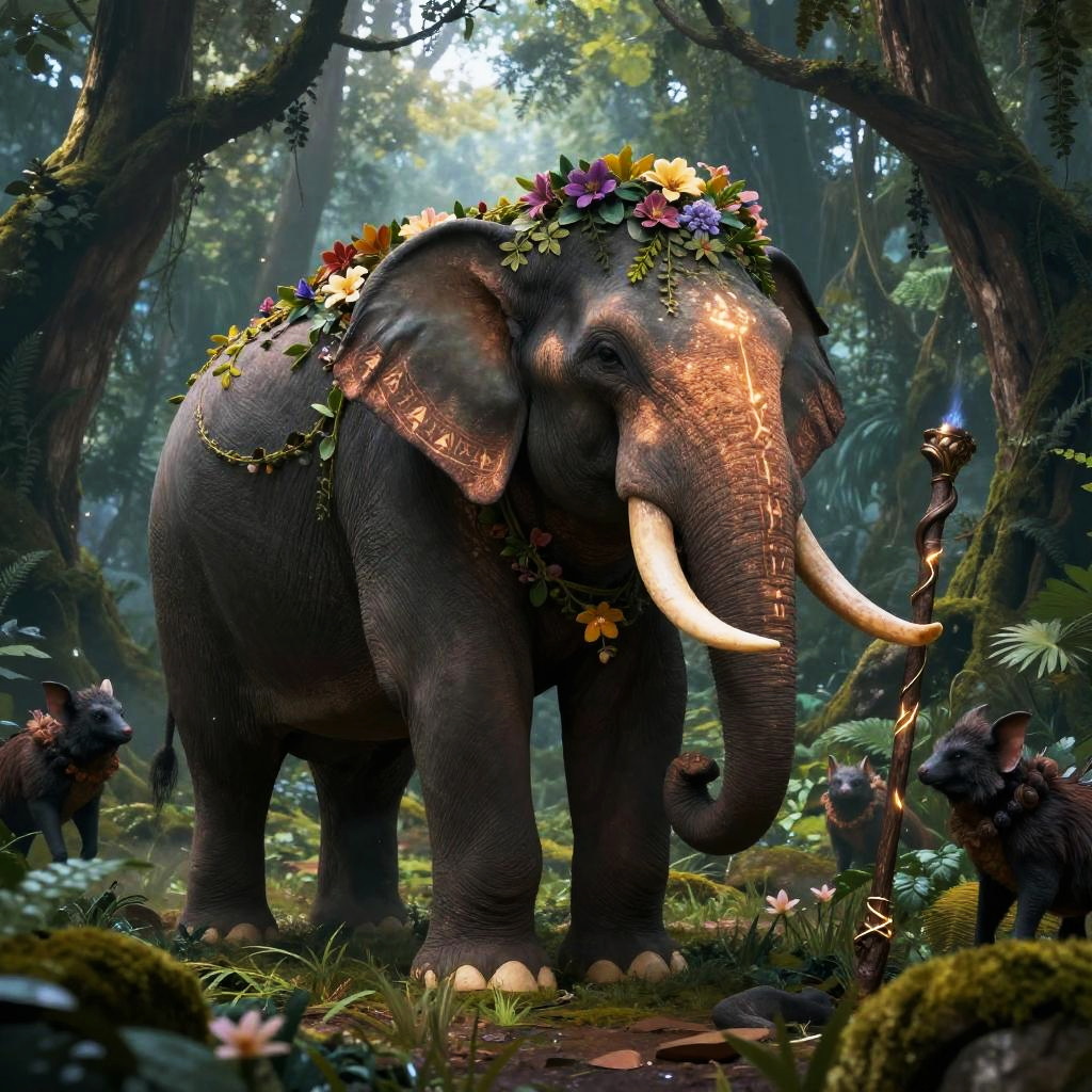 Loxodon druid in deep enchanted forest, elephant features adorned with flowers and vines, holding a staff wrapped in glowing runes, mystical creatures surrounding, misty environment with dappled light, richly detailed nature-inspired fantasy artwork.
