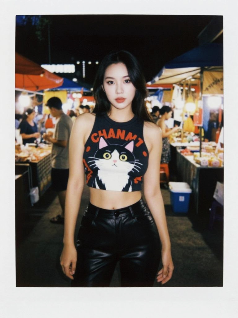 A lean woman in streetwear, wearing a cropped graphic tank top featuring a black and white cat design with red text accents, paired with high-waisted black faux leather pants. Captured in a polaroid instant camera style, she stands at the Chiang Mai night bazaar, surrounded by vibrant market stalls and colorful lights. Sexy. Pretty face and beаutiful eyes. Big breasts