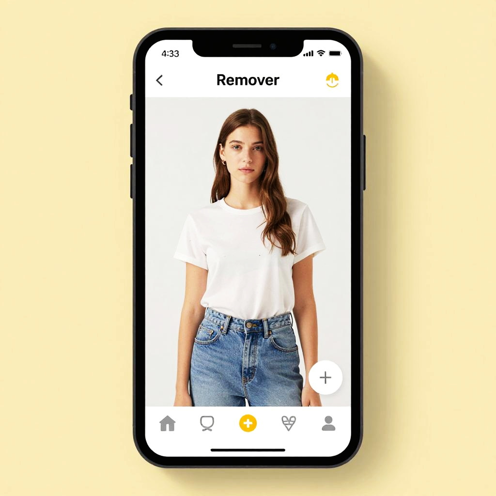 Photo clothing remover app concept, digital art of a smartphone screen showing clothing removal in progress, user-friendly interface, bright and attractive color scheme, realistic model image with layers disappearing, creative tech visualization
