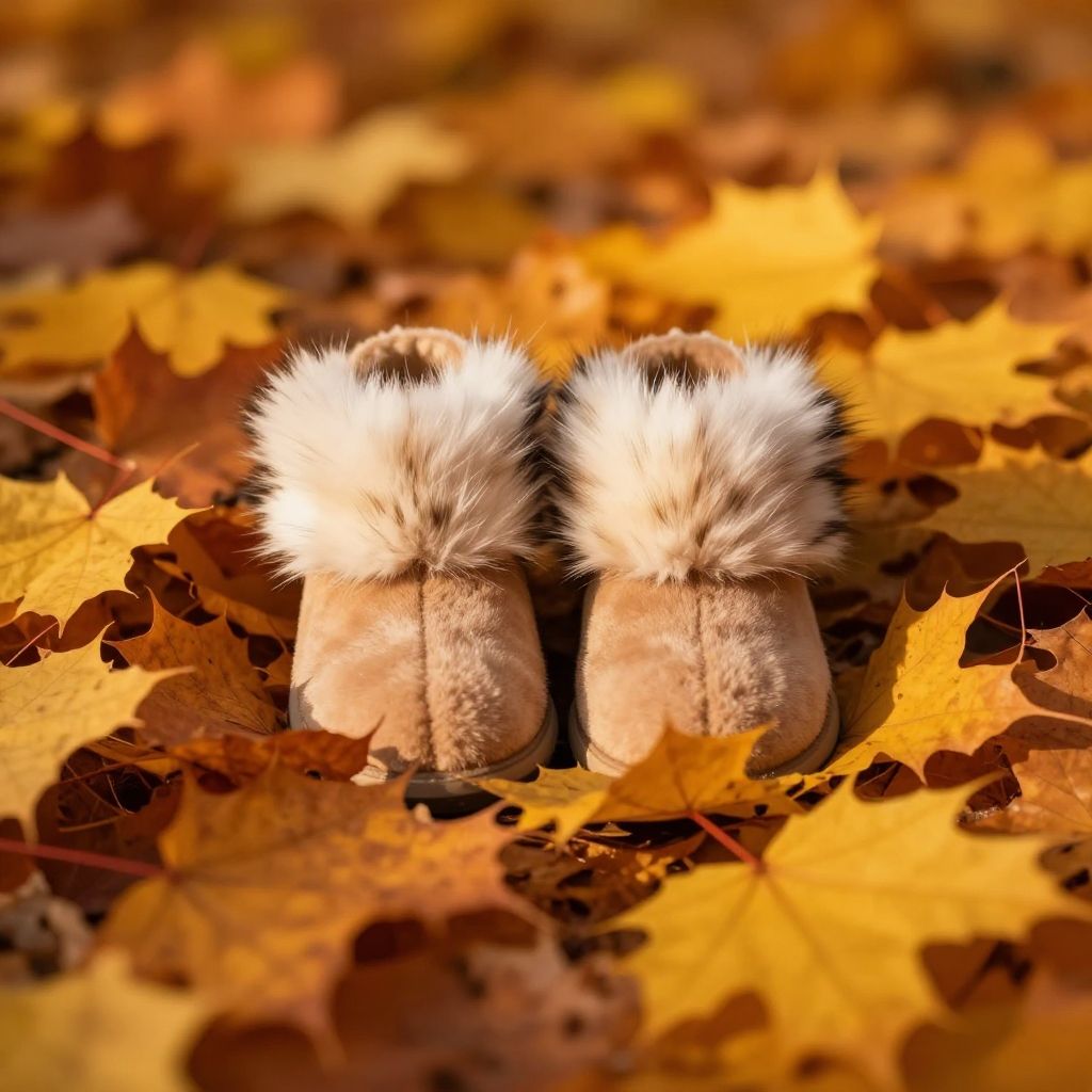 Furry toes nestled inside a bed of autumn leaves, warm fall colors, soft dappled sunlight, painterly effect, cozy and vibrant seasonal mood