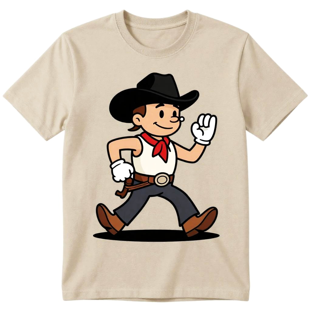 Realistic photo.Vintage western cartoon character, professional T-shirt design, dynamic and exhilarating, vector graphics, Adobe Illustrator, scalable, award-winning, in a style reminiscent of John Kricfalusi, minimalistic, cartoonish realistic photo