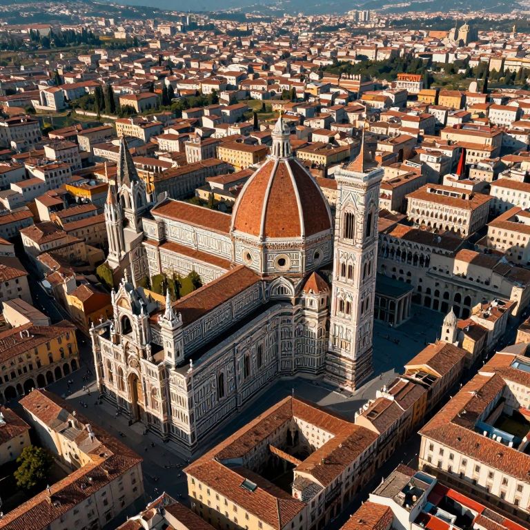Aerial photograph of Florence's Cathedral, Santa Maria del Fiore, with its red dome and twin bell towers, surrounded by densely packed terracotta