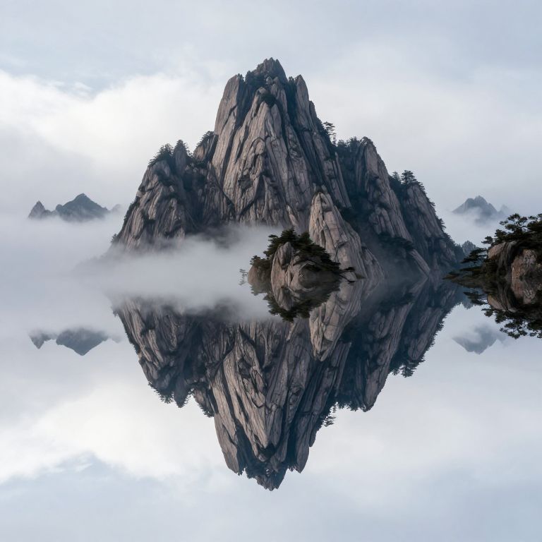 Mountain peaks rise majestically above the clouds, mirrored perfectly as they descend into the ethereal sky, creating an illusion of inverted symmetry that defies gravity and evokes the grandeur of a celestial cathedral.