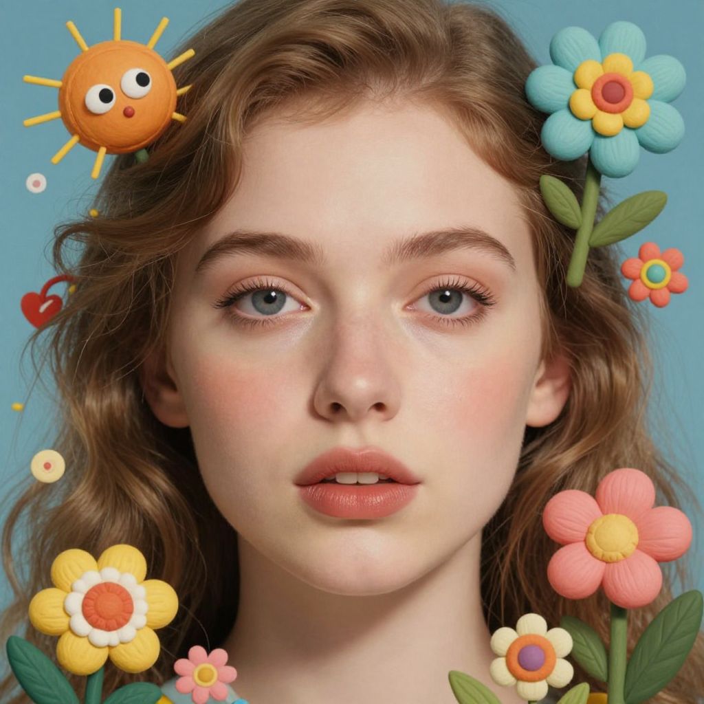 Digital portrait of a fair-skinned, blue-eyed young woman with wavy brown hair, adorned with colorful, cartoonish flowers and a smiling sun against