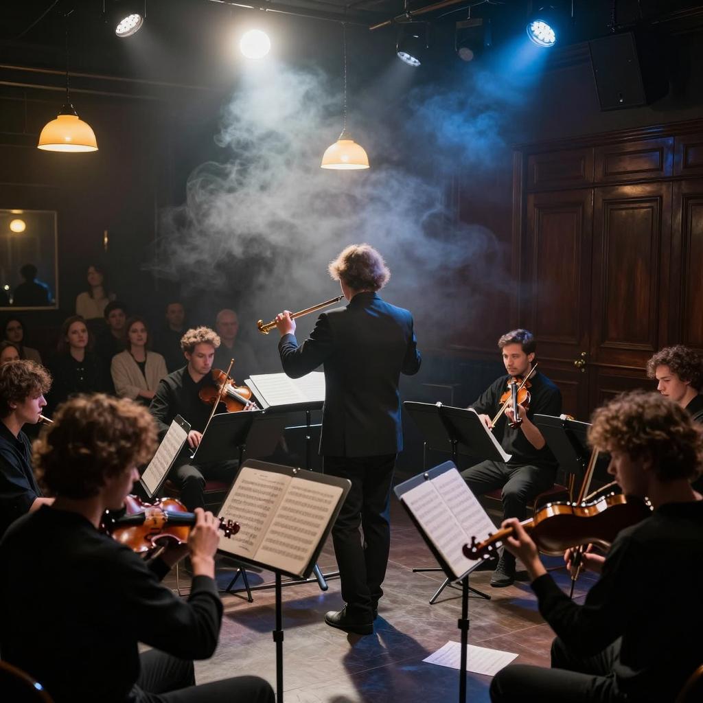 Live orchestra performance in a dimly lit, smoky room. Musicians with dark clothing, intense focus, scattered music sheets. Bright stage lights, visible smoke, two hanging lamps. Audience seated, blurred in the background. Three musicians on stage, conductor in center. Dark wood paneling, rectangular doors on the right. Blue and yellow lighting.