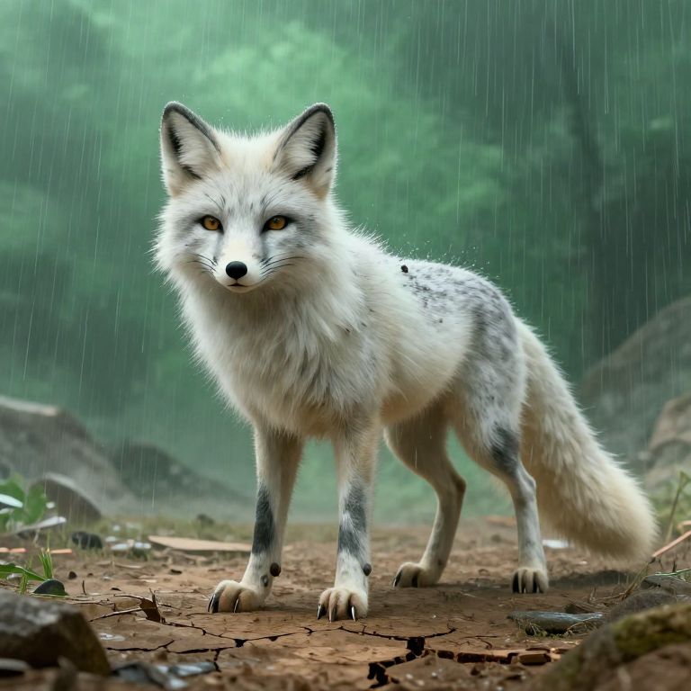 Photograph of a white fox with black-tipped ears and paws standing in a rain-soaked forest. The fox's fur is wet, glistening under the raindrops. Its yellow eyes are focused on the camera. The forest background is blurred with green foliage and dark rocks. The ground is covered in cracked, brown earth with a few green leaves scattered. The rain creates diagonal lines across the image, adding a dynamic, textured effect. The fox's posture is alert, with its tail slightly raised and body facing forward. The overall mood is serene yet intense due to the rain and the fox's attentive gaze.