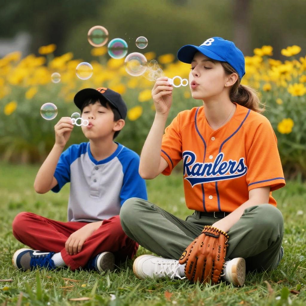 Photograph of a young woman and boy sitting on grass, blowing bubbles. Woman in orange baseball shirt, green pants, blue cap, brown glove. Boy in grey and blue jersey, red pants, black cap. Yellow flowers in background, green foliage. Both looking at each other, relaxed. Grass and flowers in foreground.
