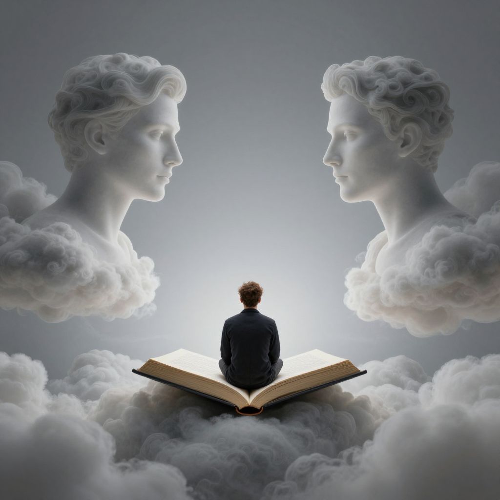 Excellence a man writing a books between clouds, in the style of spatial concept art, 32k uhd, alejandro burdisio, shilin huang, high detailed, nebulous forms, patrick brown,