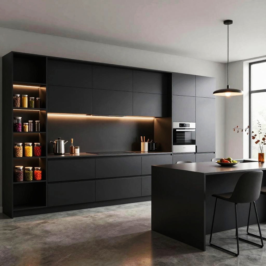 Kгјchen ultra-modern kitchen with glossy black cabinetry, neon under-cabinet lighting, futuristic appliances, minimalist open shelving with colorful spices, polished concrete floor, clean lines, and a large island with bar stools, vibrant and stylish