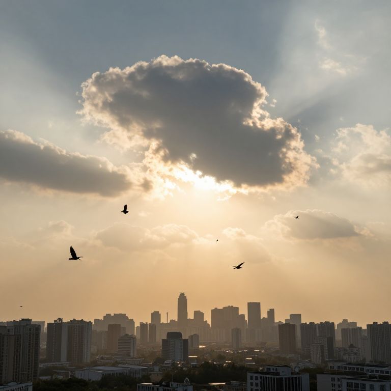 Sunlight pierces through towering cumulus clouds, casting radiant beams over a sprawling cityscape as seven birds soar gracefully between the golden-hued formations.