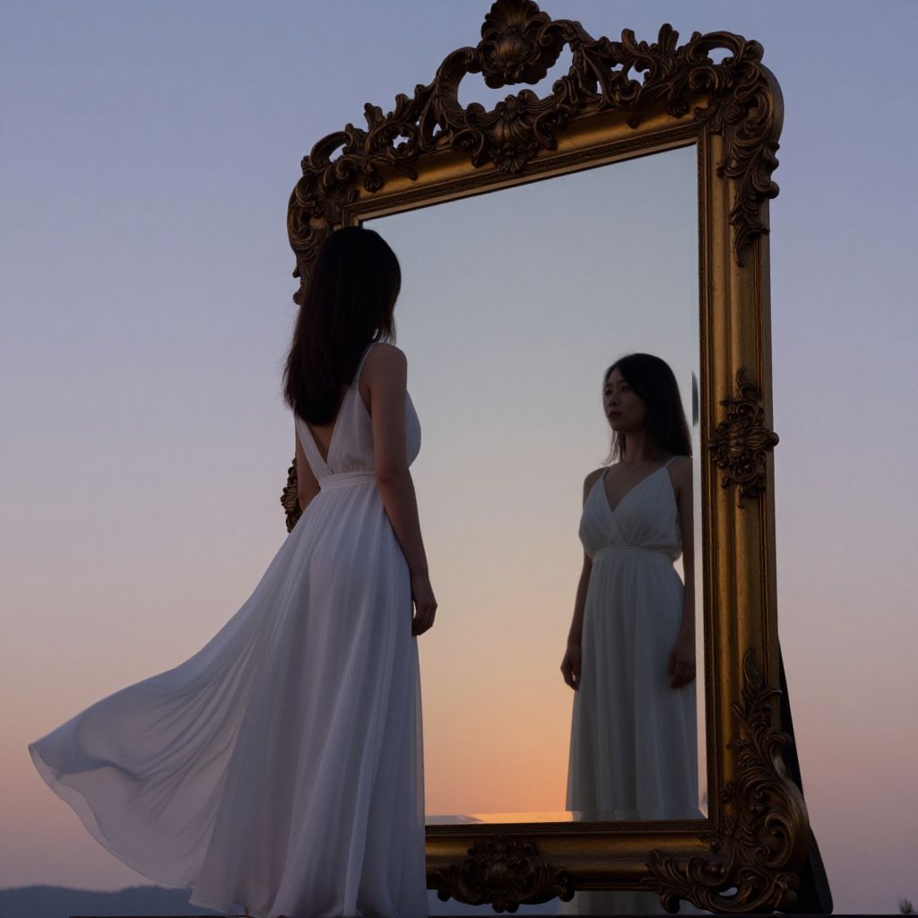 Woman in a flowing white dress stands beside an ornate gold-framed mirror, her reflection absent as she gazes toward the setting sun, casting a serene silhouette against the twilight sky.