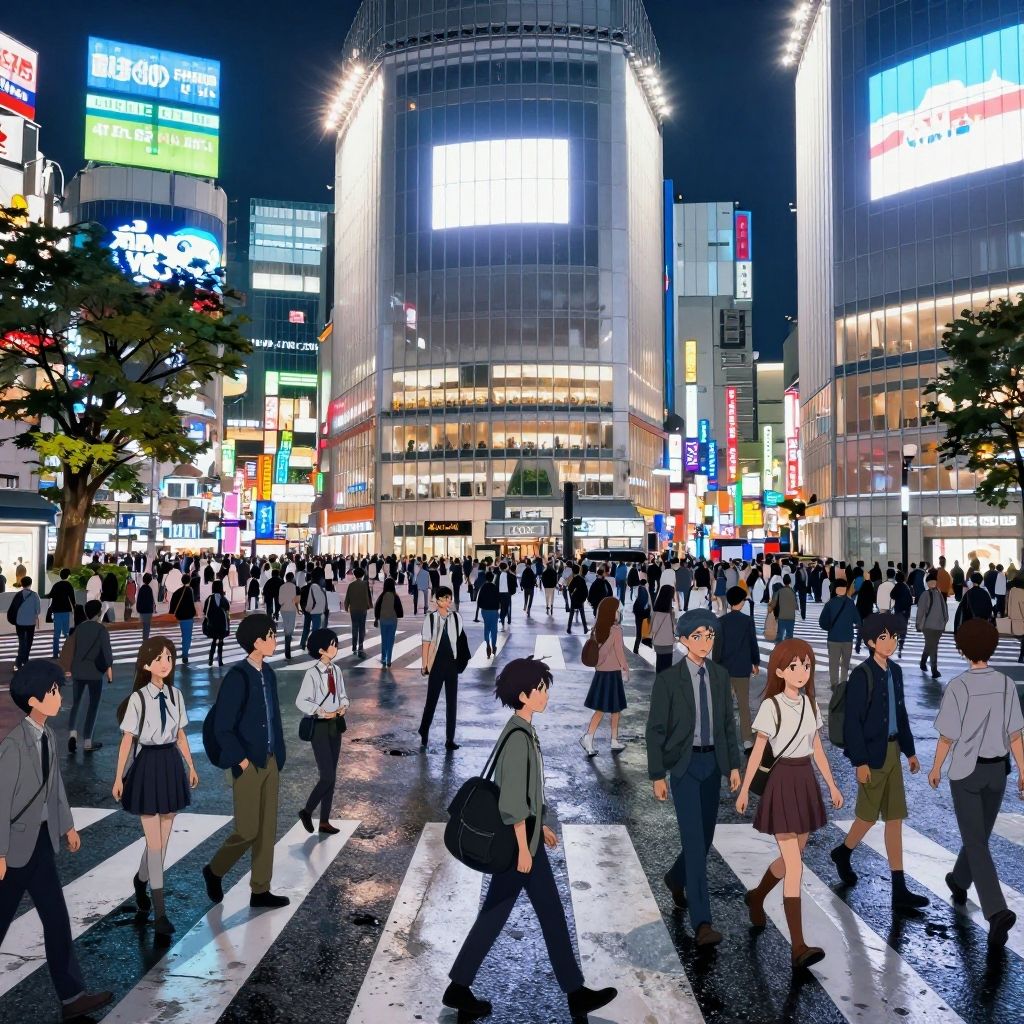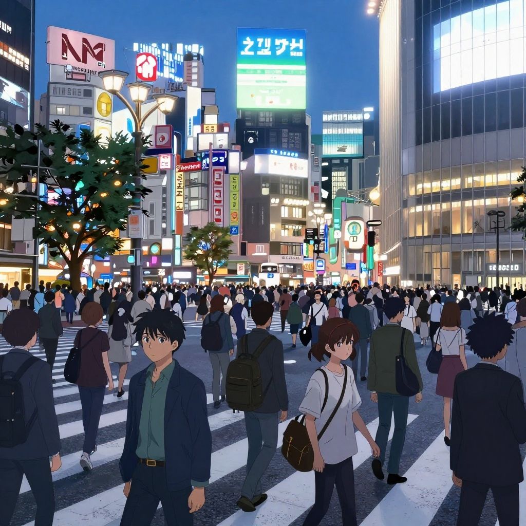 Shibuya Crossing anime art capturing evening rush hour, illuminated street lamps and glowing storefronts, mix of futuristic and traditional Tokyo elements, animated crowd diversity in stylish outfits