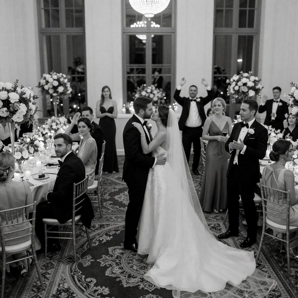 Black and white photograph of a wedding reception showing a bride and groom sharing a kiss in the center of the room. The bride wears an elaborate white gown with a long veil, and the groom is in a classic black tuxedo. Guests in formal attire, including women in elegant dresses and men in suits and tuxedos, surround the couple. Floral centerpieces decorate the tables, and some guests are seated while others stand, clapping and holding drinks. The room features an ornate patterned carpet, tall windows, and a high ceiling with a chandelier.