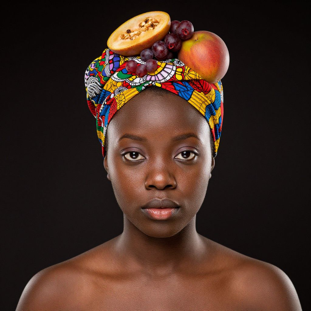 Photograph of a dark-skinned woman with a serious expression, set against a black background. She is shirtless, showcasing her smooth, dark complexion. Her head is adorned with a vibrant, multicolored patterned headwrap, featuring bright red, yellow, blue, and green hues. Atop the headwrap are a halved orange with seeds visible, a whole red apple, and a cluster of purple grapes. The headwrap's intricate design contrasts with the simplicity of her bare shoulders and the stark black background. The image focuses on her face and head, highlighting the colorful, textured headwrap and the fresh, natural fruits.