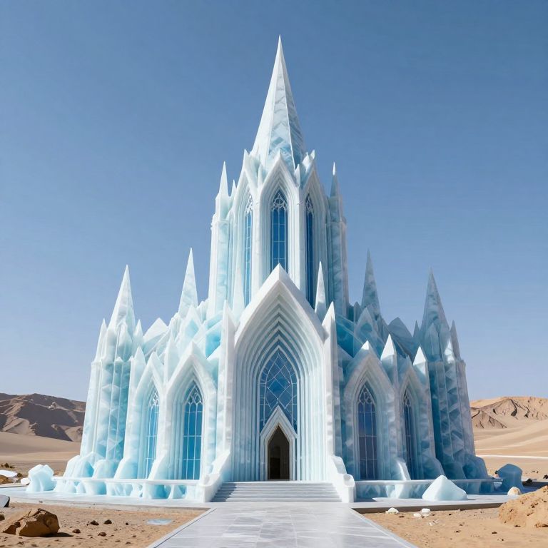 A surreal 3D-rendered glacier cathedral rises majestically in a stark desert landscape, its crystalline spires and harmonious arches bathed in ethereal light, evoking a sanctuary of icy beauty and auditory resonance.