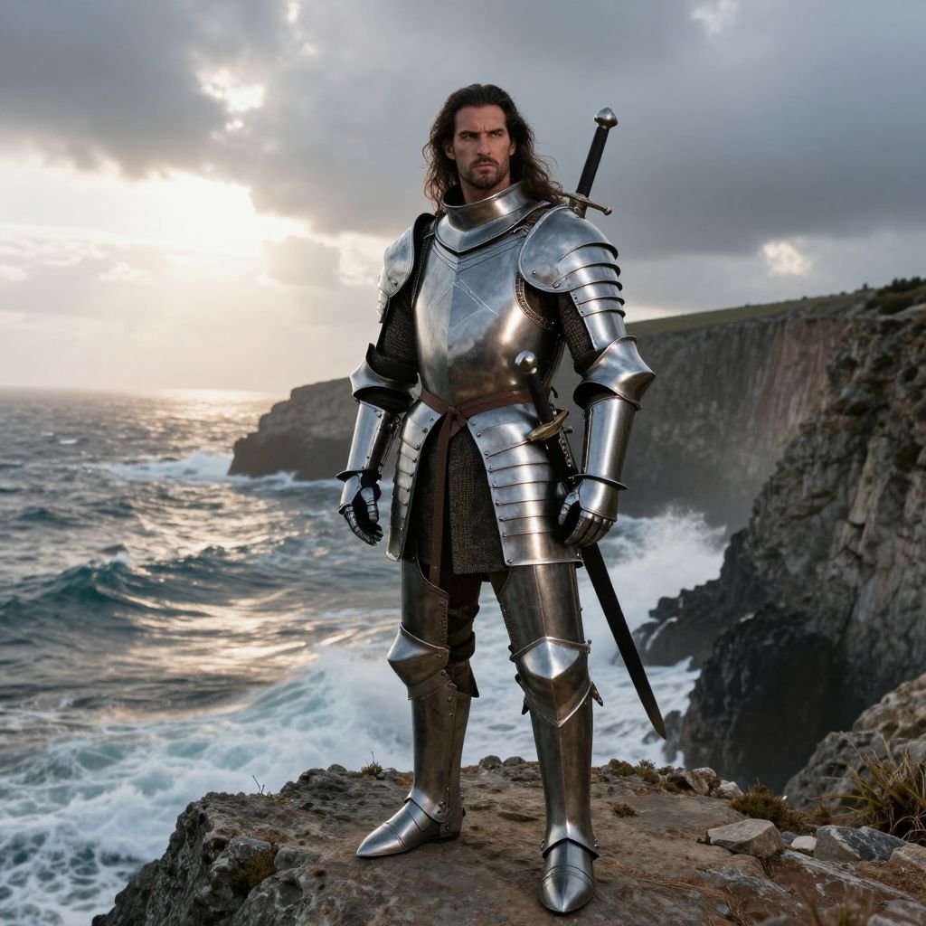 Photograph of a muscular, long-haired man with a serious expression standing on a rocky cliff by the ocean. He's wearing shiny, full-body medieval armor with a sword sheathed on his back. The sky is cloudy with dramatic light breaking through, illuminating the waves crashing below. The ocean and cliffs create a rugged, epic background. The armor reflects the sunlight, adding a metallic sheen to the scene.