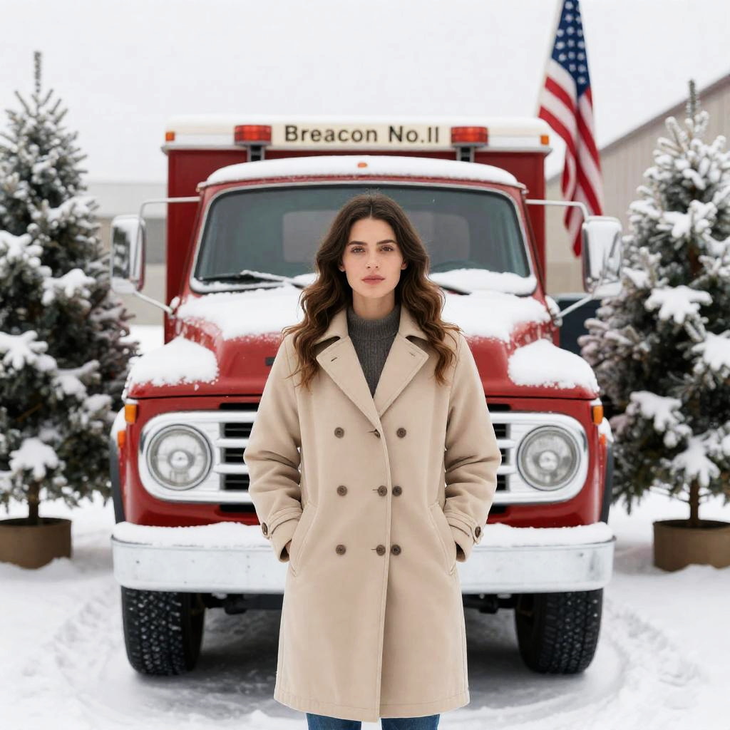 Woman in brown coat and dark pants, standing in snow, leaning against a wooden ski pole. Snowy outdoor setting, red truck on right, wooden shed on left, trees in background. Overcast sky, snow falling. Neutral facial expression.