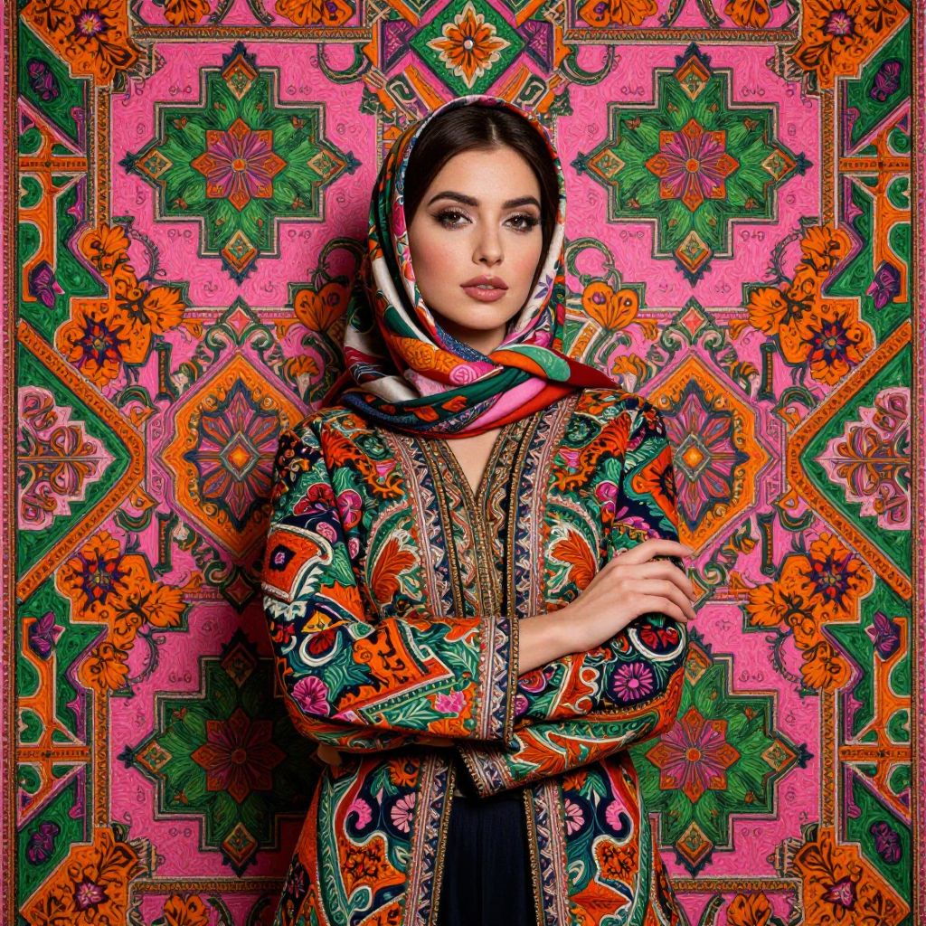 The image presents a highly detailed and hyperrealistic fashion magazine cover design, featuring a traditional Anatolian pattern background in vibrant shades of pink, green, and orange. The intricate geometric and floral motifs create a rich, textured backdrop that frames a woman's portrait. The woman is adorned in a traditional Anatolian outfit, which mirrors the patterned design of the background, showcasing a harmonious blend of cultural heritage and contemporary fashion. Her attire includes a headscarf and a jacket with elaborate embroidery, complemented by detailed oil paint-like textures that add depth and realism to the image. The overall composition is balanced, with the woman centrally positioned, her arms crossed, and the patterns extending outward, creating a sense of symmetry and unity. The interplay of colors and the meticulous attention to detail in the patterns and textures contribute to a visually striking and culturally rich representation.