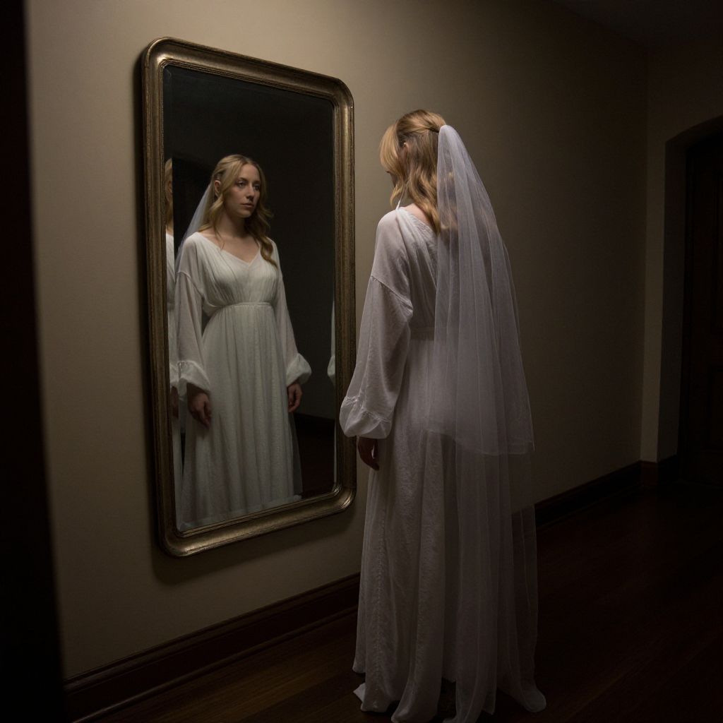 In a dimly lit corridor, a woman in a ghostly white gown stands before a mirror that reflects her past self, defying the boundaries between memory and reality.