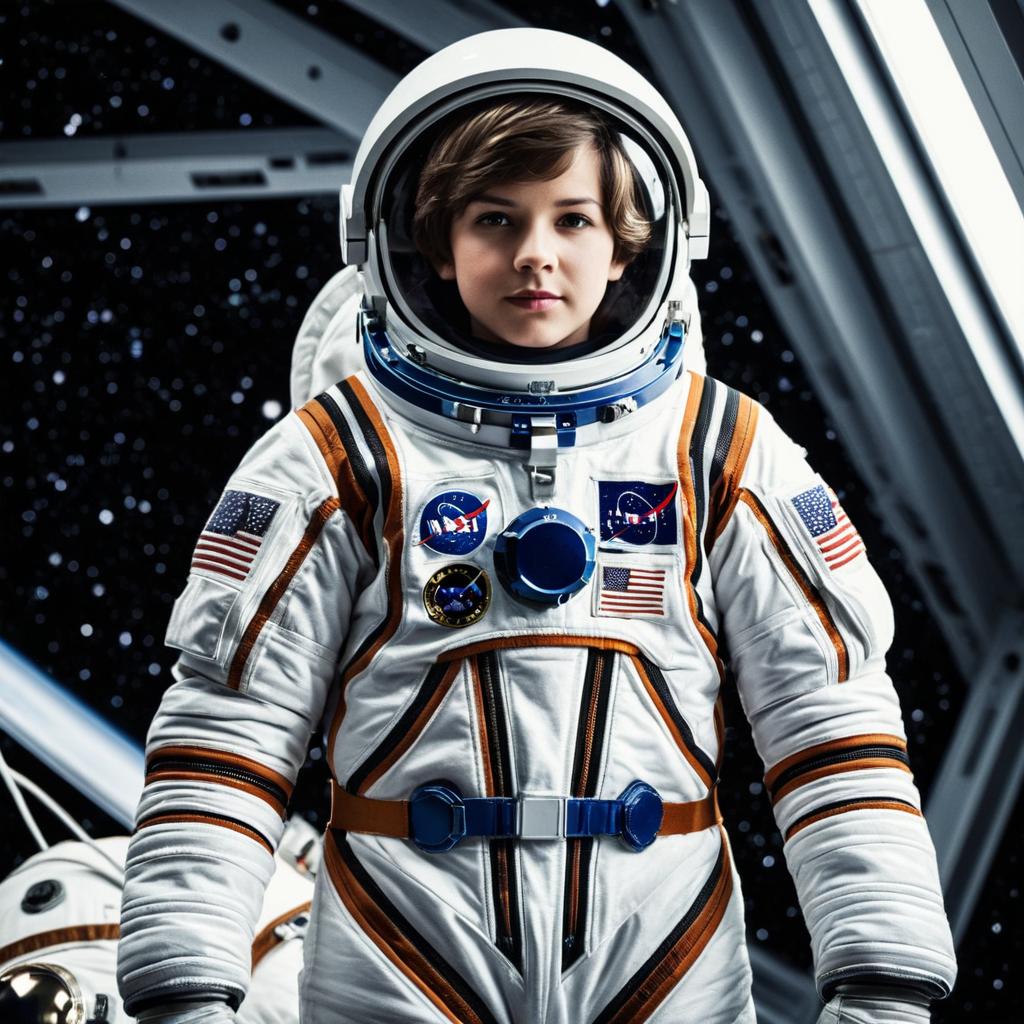 A young boy with brown hair wearing a detailed NASA spacesuit with American flag patches and multiple mission badges stands inside a space station module. He is looking directly at the camera with a calm expression. The background shows the window view of outer space with stars visible outside.