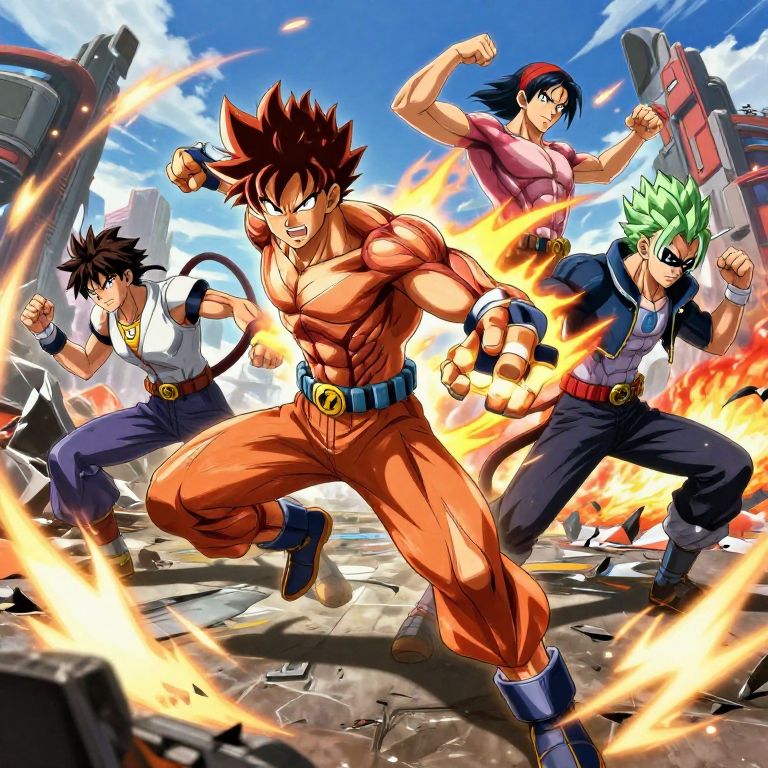 How to create anime characters posed dynamically in action scenes, with fluid motion and energy effects, rendered in vivid digital art style with detailed muscle anatomy and vibrant color palettes, on a battle-ravaged futuristic battlefield.