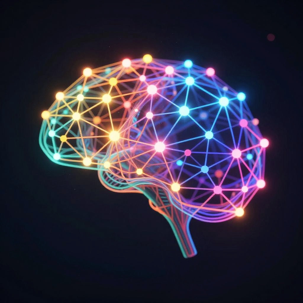 AI vector image featuring a stylized brain formed by interconnected nodes and lines, glowing softly in shades of electric blue and teal, set on a minimalist white background to represent neural networks and cognitive AI systems.