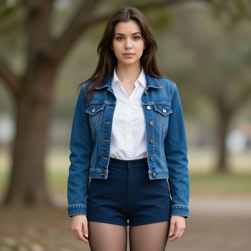 "home shego costume, solo, 1girl, brown pants, brown hair, long hair, pants, looking at viewer, sweater, standing, long sleeves, blue sweater, closed mouth, shirt, blurry, brown eyes, blurry background, outdoors, realistic Realistic photo of casual sexy person with pretty face"