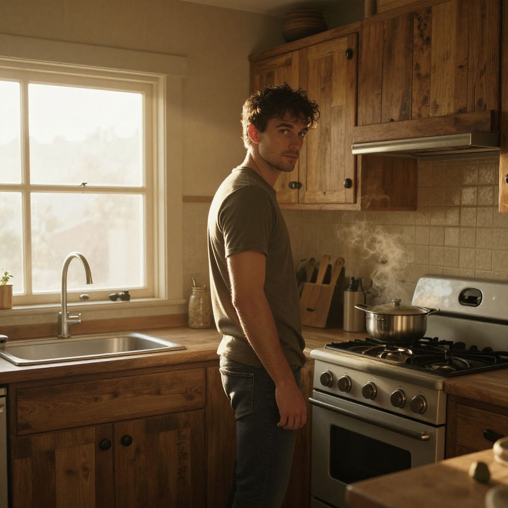 [[man,kitchen image]]Intimate scene of a man standing in a cozy kitchen, bathed in warm golden hour light, as sunlight streams through large windows, illuminating rustic wooden cabinets, countertops, and appliances, creating a peaceful ambiance, soft shadows accentuating the textures, warm tones, inviting aroma wafting from the stove. Man has masculine face and piercing eyes