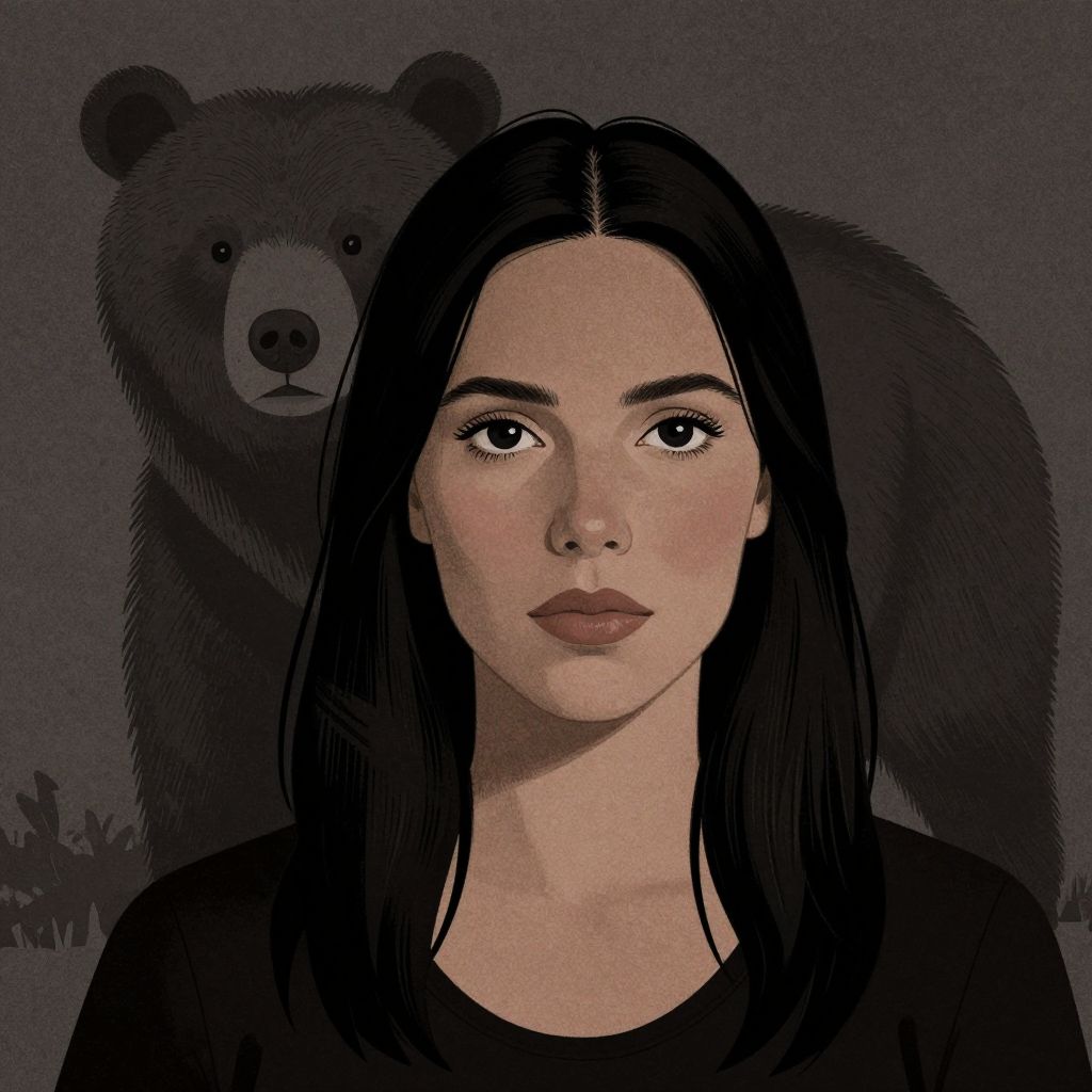 Digital illustration of a young woman with long, straight black hair, fair skin, and full lips, wearing a black top. She has large, dark eyes and a neutral expression. A large, dark brown bear with a slightly menacing expression stands behind her, its fur textured and realistic. The background is a dark, muted purple, adding a mysterious atmosphere. The woman's face is centered and prominent, while the bear is slightly to the left and behind her. The style blends realism with a slightly surreal, digital art aesthetic.