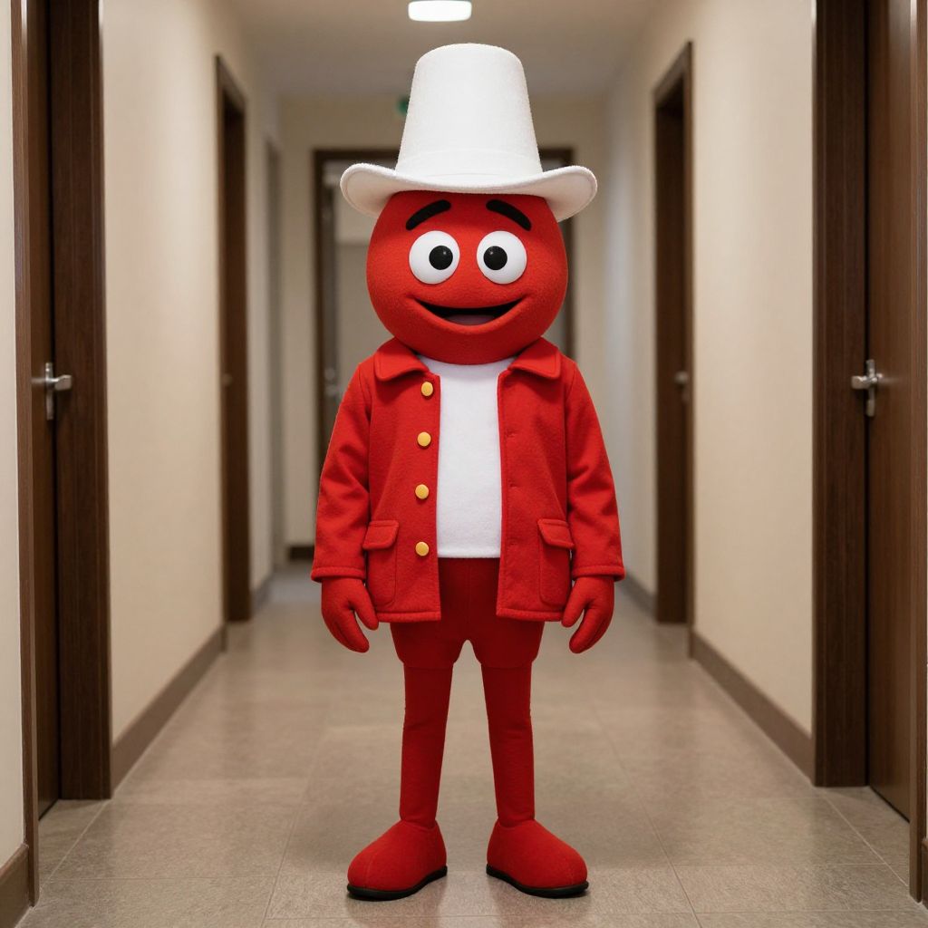 Photograph of a red, cartoon-style mascot with a white hat, red jacket, white shirt, and red pants, standing in a brightly lit,