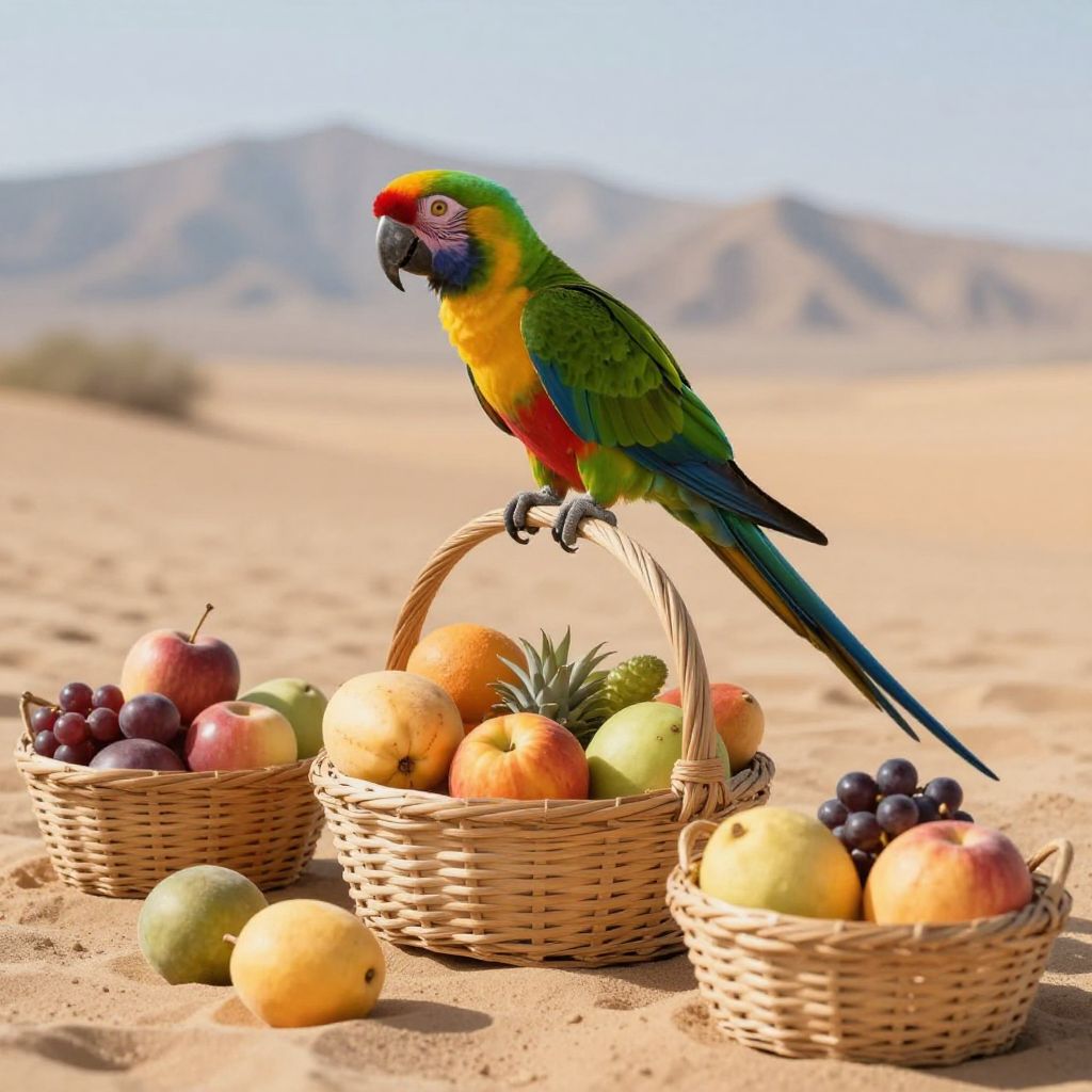 Vibrantly colored parrot perched in a woven basket filled with assorted fruits, surrounded by two additional baskets also containing various types of fruit, set against a sandy desert landscape with mountains in the background.