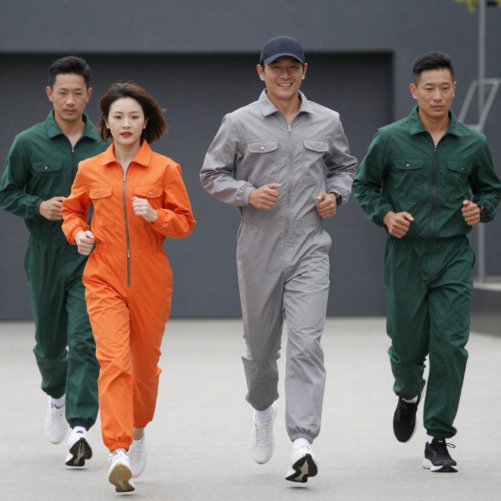 Photograph of four people running outdoors. Front woman in orange jumpsuit with short brown hair, determined expression. Man in gray jumpsuit with cap, smiling, mid-stride. Two men in green jumpsuits, focused expressions, following. Background: dark building, metal structures.
