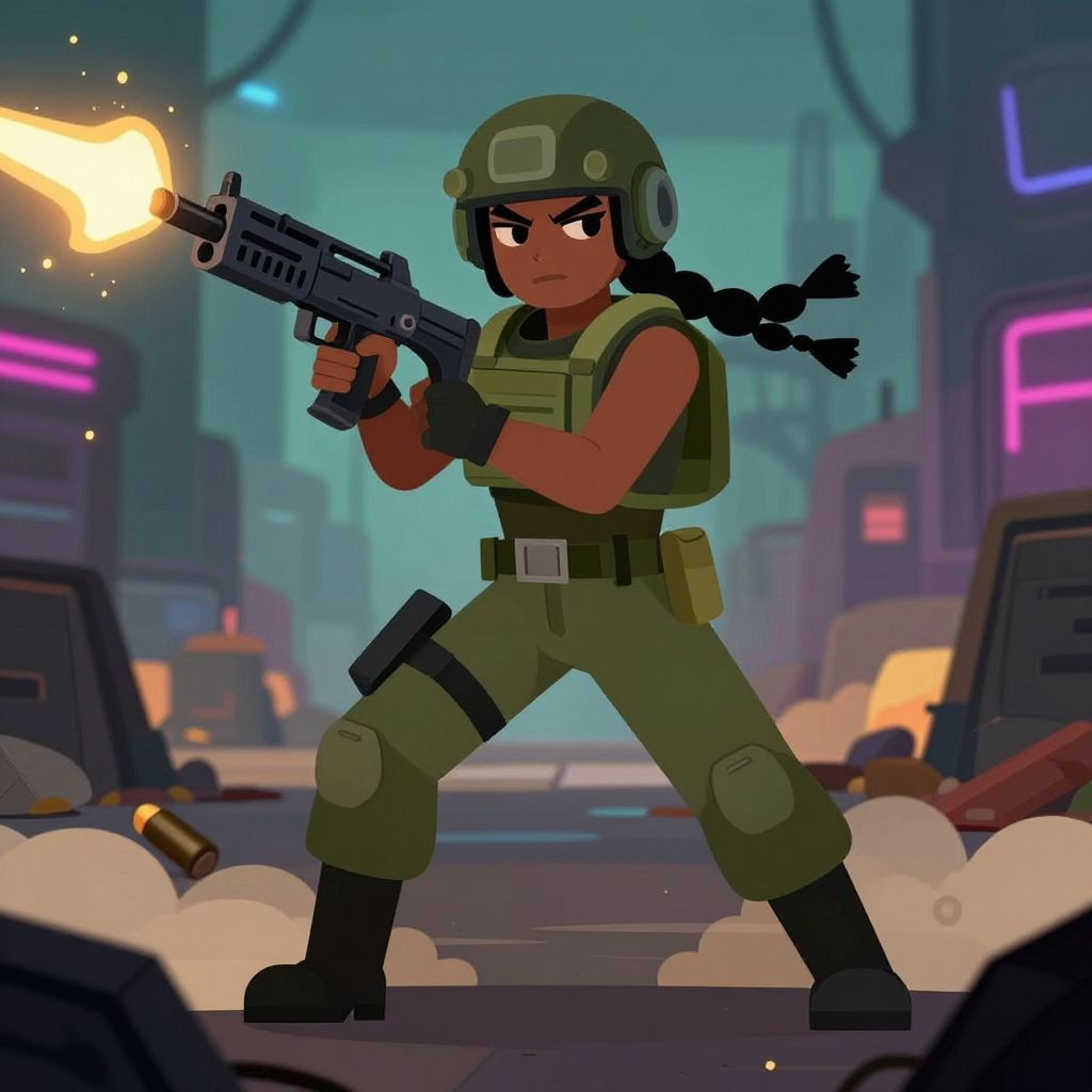 Digital illustration of a fierce, dark-skinned female soldier in green uniform, helmet, and braid, firing a glowing gun in a neon-lit