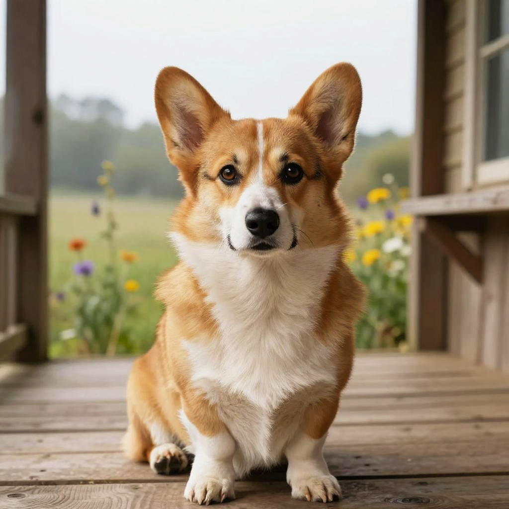 Portrait of a cattle dog corgi mix with expressive eyes and perky ears, sitting on a rustic wooden porch with soft morning light and wildflowers in the background