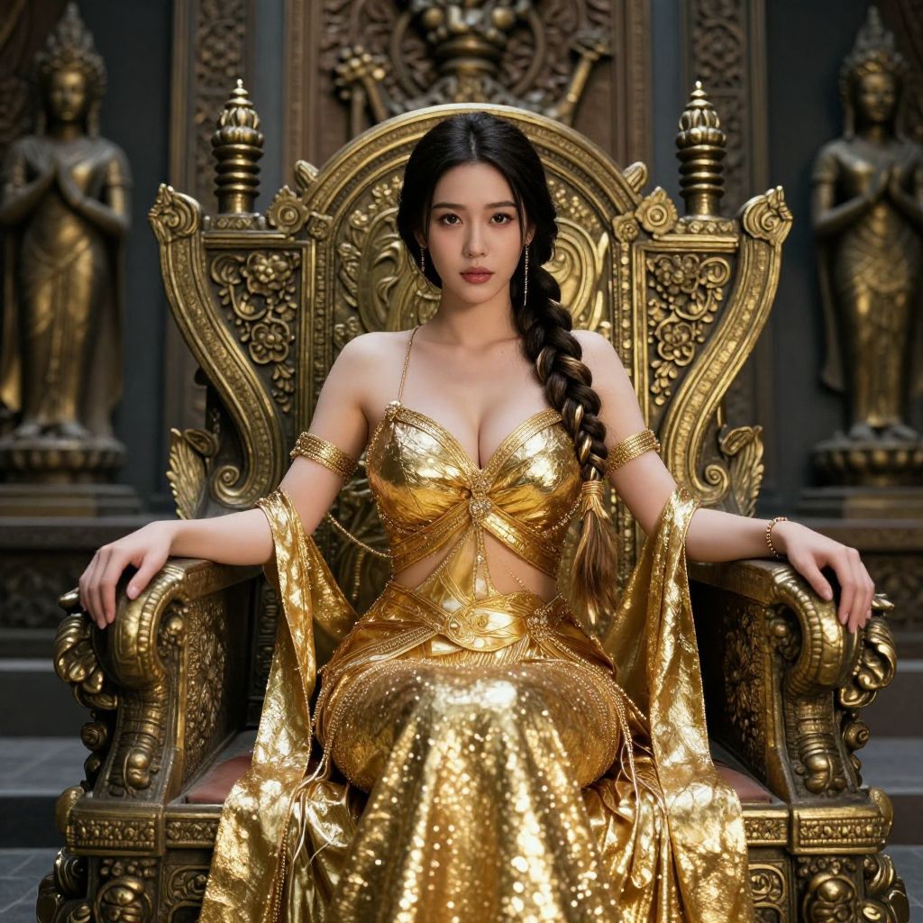 Photorealistic digital artwork of an Asian woman with long black hair in a braid, sitting on an ornate, gold-embellished throne. She wears a shimmering, gold sequined, strapless top with a deep neckline and matching skirt, draped with gold fabric over her shoulders. Her skin is fair, and she has a serene expression. The throne has intricate carvings and is set against a dark, ornate background with golden statues. The overall style is regal and opulent, with a focus on rich textures and luxurious details.