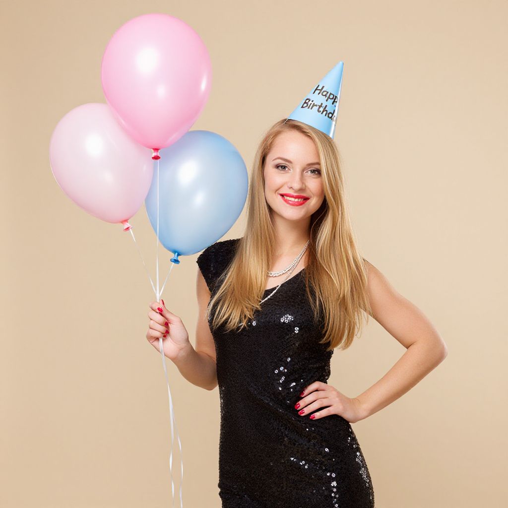 Photograph of a young woman with fair skin and long, straight blonde hair, wearing a black, sequined, sleeveless dress and a light blue "Happy Birthday" party hat. She holds three balloons—two pink and one blue—in her right hand. She has red lipstick and a pearl necklace, and she stands against a plain beige background. Her left hand rests on her hip, and she smiles at the camera. The image is brightly lit, highlighting her cheerful expression and festive attire.