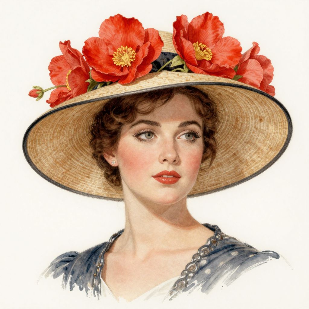 A vintage-style illustration featuring a woman adorned with a wide-brimmed hat decorated with vibrant red flowers, rendered in a detailed, high-definition digital art style reminiscent of T.A. Mavrina's watercolor technique from 1938.