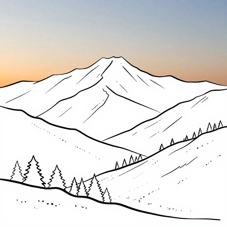 Create outline drawing from photo of a serene mountain landscape at sunrise, emphasizing crisp lines and minimal shading, capturing the natural contours and features in a clean, artistic style suitable for hand-drawing or digital sketching.