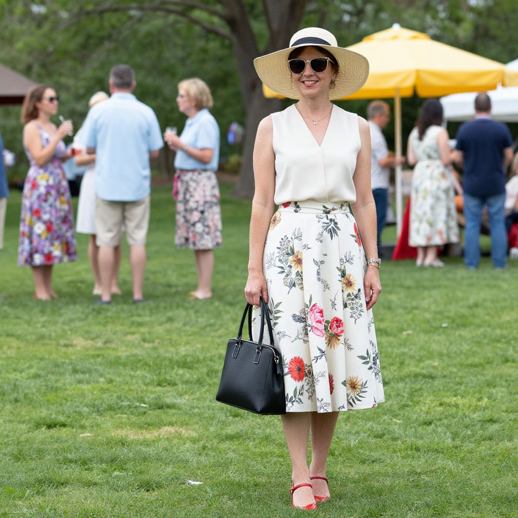 Photograph of a smiling woman standing on a grassy lawn at an outdoor event. She wears a white sleeveless blouse, a white floral skirt with red and yellow flowers, a wide-brimmed straw hat, round sunglasses, and red sandals. She holds a black leather handbag in her right hand. In the background, several people in casual summer attire are standing and chatting under a yellow umbrella. The scene is bright with green grass and trees, and the overall mood is sunny and relaxed.