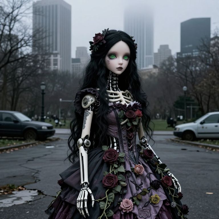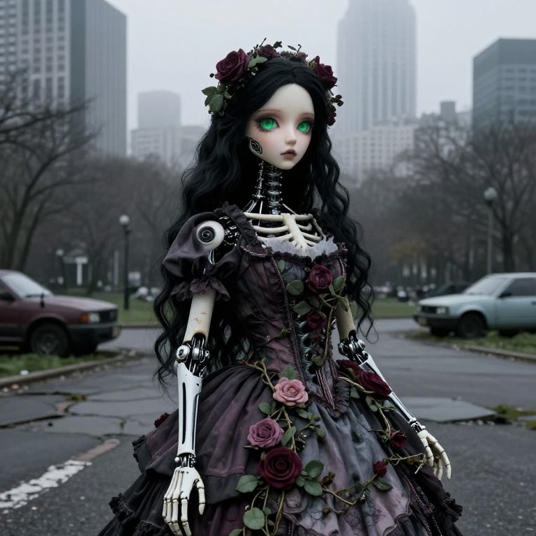 Long haired, A female character with a delicate doll-like face and luminous green eyes, wearing a gothic Victorian dress entwined with roses and vines, She stands in a dimly lit city park, her mechanical skeletal features exposed and intricately detailed with floral patterns, The scene is set against a foggy backdrop of a modern cityscape with towering skyscrapers, cracked pavement, and abandoned vehicles, all captured in extreme realism with a 35mm camera filter