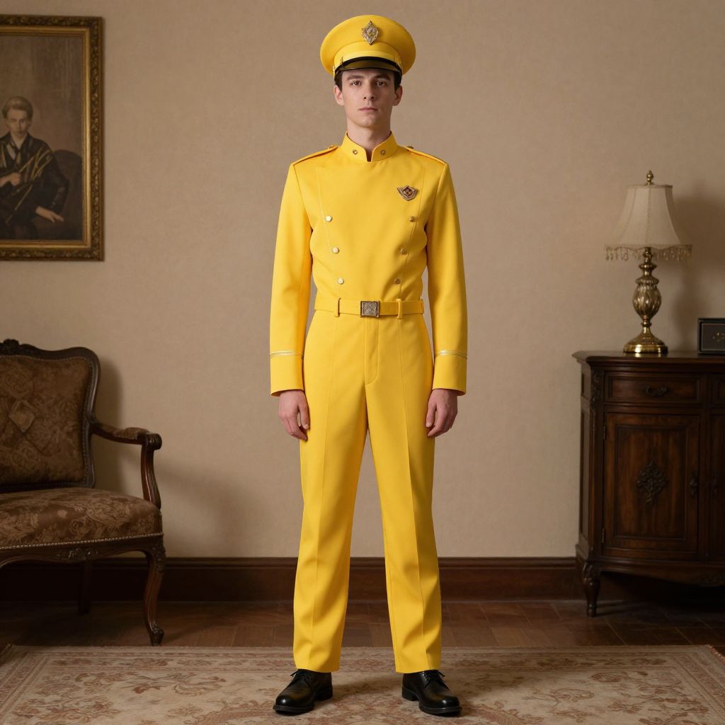 Photograph of a young man standing in an elegant room. He is wearing a bright yellow military-style uniform with a matching hat, black shoes, and a silver belt. The uniform has a single button on each sleeve, a badge on the left chest, and a pocket on the right side. He stands with his arms relaxed at his sides. The background includes a beige wall with a framed portrait on the left, an antique armchair with brown upholstery, and a wooden side table with a vintage lamp. The floor is carpeted in a neutral tone.