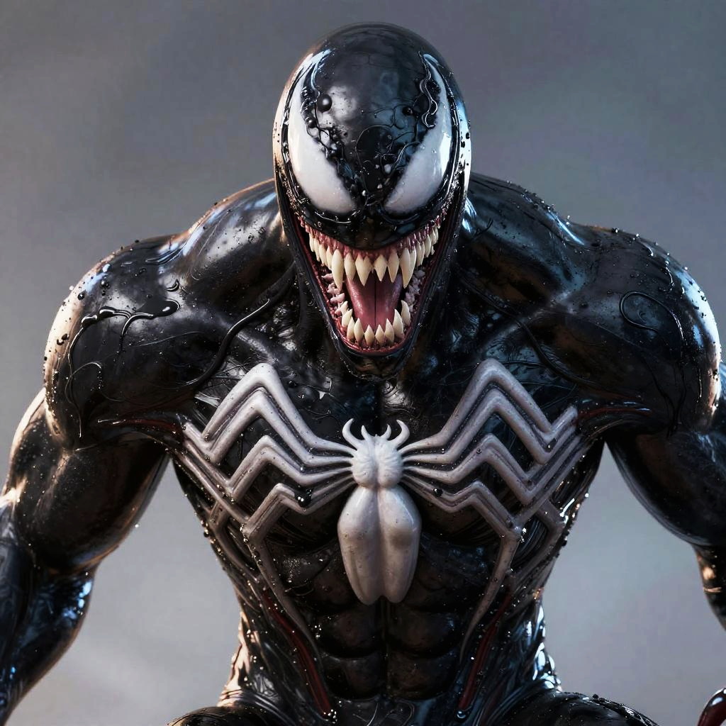 Venom front view portrait, highly detailed symbiotic alien with glossy black skin and white spider emblem, sharp fangs bared, intense glowing eyes, liquid-like texture, dramatic shadows, vivid realism, comic book style illustration.